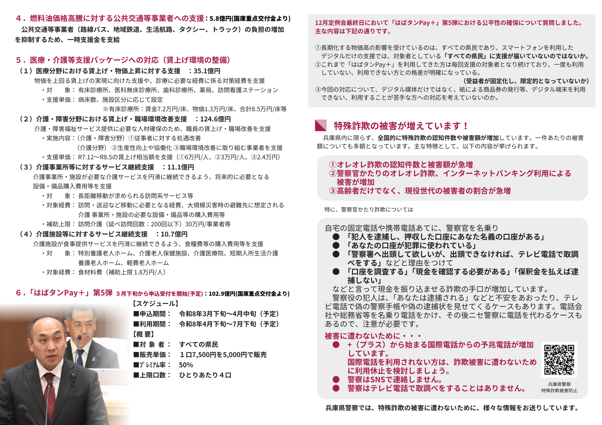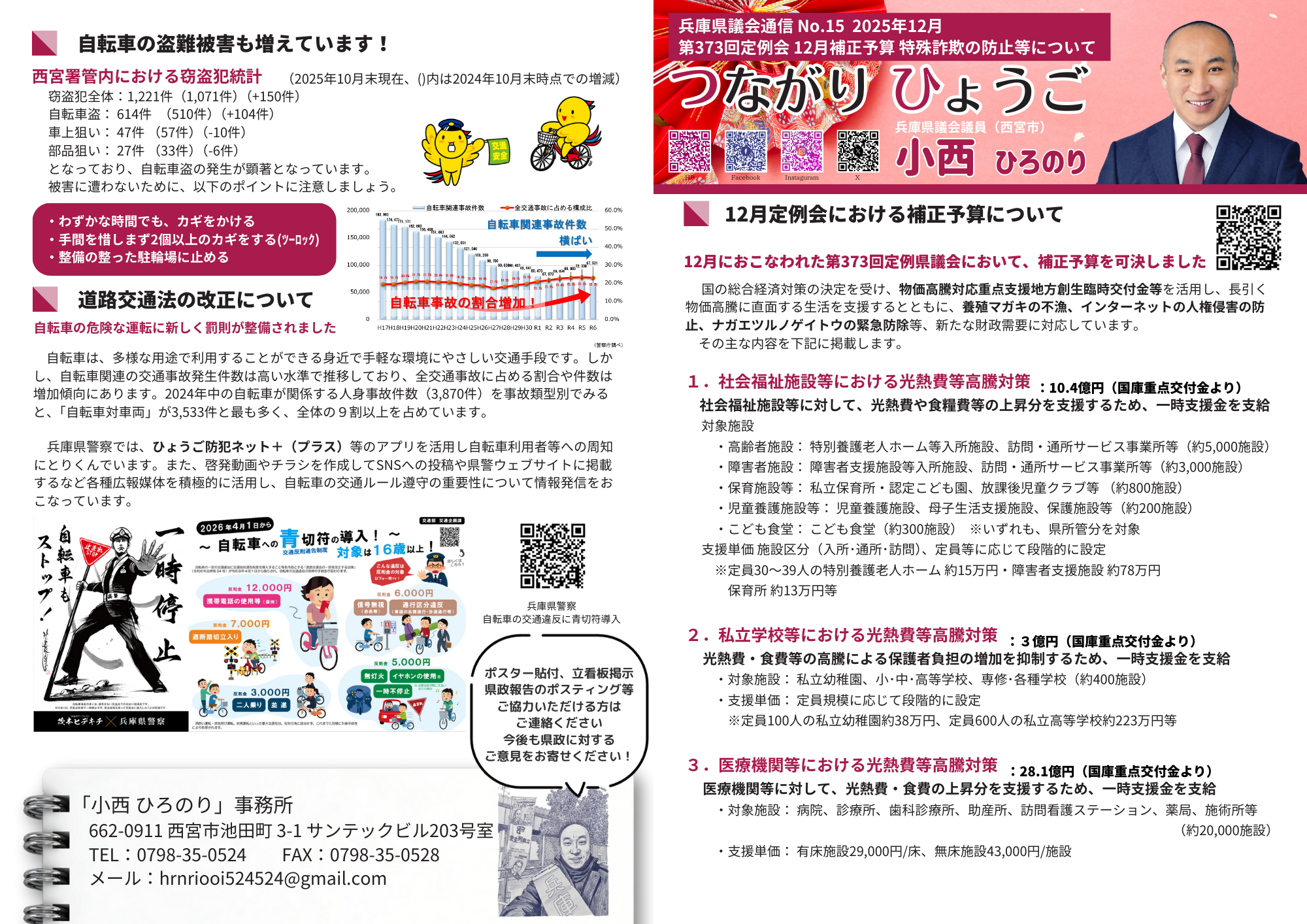 12月定例会における補正予算、特殊詐欺や盗難の防止対策、自転車への青切符の導入(道路交通法の改正)について掲載しています。